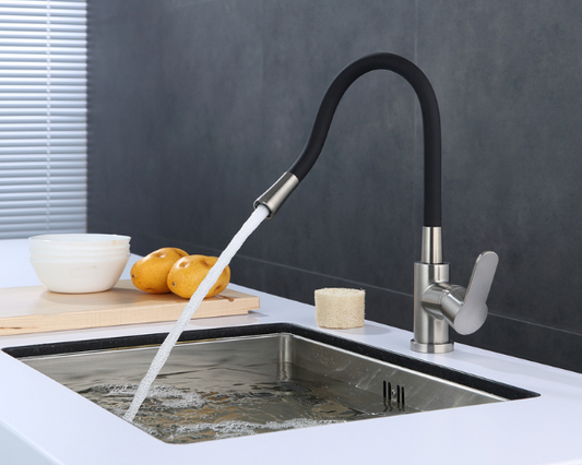 Robinet de cuisine à poignée unique avec tuyau en silicone noir en Chrome poli