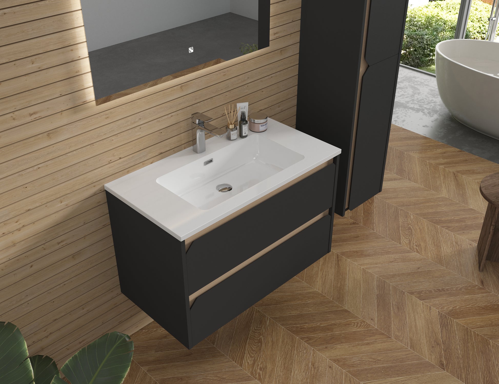 Le meuble est surmonté d’un lavabo intégré au design moderne, alliant esthétisme et fonctionnalité. Sa finition mate foncée apporte profondeur et caractère, tout en restant intemporelle.