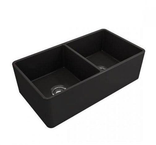 Évier de cuisine double de style ferme à tablier de 33 x 19 pouces en composite de granit noir, 50/50