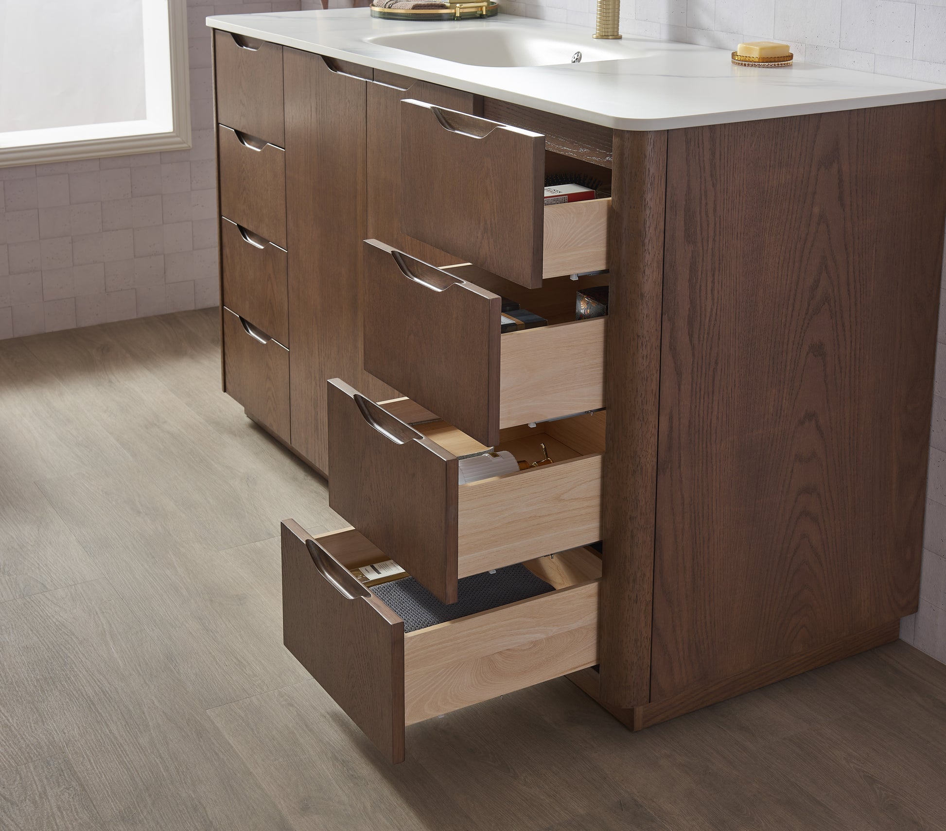La vanité Valenca se distingue par son design minimaliste et chaleureux, mis en valeur par un magnifique fini bois qui apporte une douceur naturelle à la salle de bain. Ses lignes épurées et ses poignées intégrées créent une esthétique moderne et sans artifices, parfaite pour ceux qui recherchent un style contemporain bien équilibré. Dotée d’un généreux espace de rangement avec ses tiroirs symétriques et ses portes centrales, elle combine élégance et fonctionnalité au quotidien. La Valenca offre une présence raffinée qui transforme subtilement l’espace tout en maximisant le confort d’utilisation.